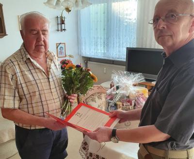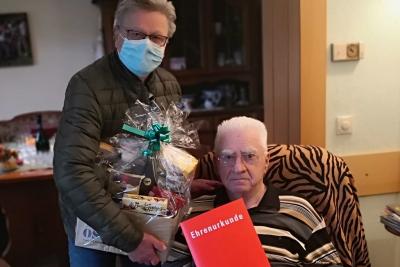 Am 06.11.2020, also am Vorabend der leider coronabedingt ausgefallenen Jubilarehrung konnte der KV Erfurt / Sömmerda zwei Mitglieder für 70 Jahre Mitgliedschaft in der IG BAU ehren. Der stellvertretende Bezirksvorsitzende Koll. Jürgen Kaiser besuchte die Kollegen Günter Koppe in Erfurt und Eberhard Thiele in Alperstedt. Beide sind seit dem 01.11.1950 gewerkschaftlich organisiert. Wegen der vorgegebenen Kontaktbeschränkungen konnte leider kein Vertreter des Kreisvorstandes teilnehmen und das "Ostpaket", Ehrenurkunde, Ehrennadel und Bluemenstrauß überreichen. Das geplante gemeinsame Kaffeetrinken musste leider ebenfalls ausfallen. Trotz kleinerer Probleme sind die Jubilare gesundheitlich relativ fit und sprachen die Hoffnung aus, bei der nachgeholten Jubilarehrung im nächsten Jahr dabei sein zu können.