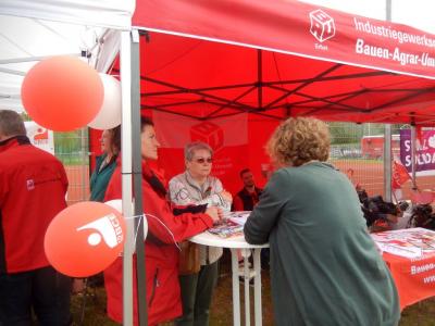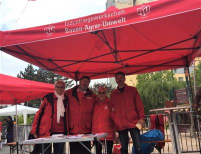 In Apolda wird nicht nur geredet und demonstriert. Hier wird auch für den guten Zweck gegessen und getrunken. Der Obolus für die gesponserten Bratwürste und das „Frei“-Bier gingen an eine soziale Einrichtung der Stadt. Unser IG BAUler Bernd Unbescheid macht diese Spendenübergabe mit besonderer Freude.