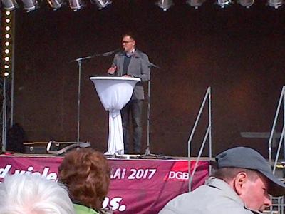 DGB Kreisvorsitzender Torsten Lerche begrüßt die Besucher und "führt" durch das Programm.