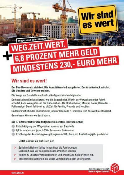 Eine gut eingerichtete Baustelle bietet Schutz für Beschäftigte und Passanten. Geordnete Arbeits- und Wegezeiten bieten Arbeitsschutz für die Beschäftigten am Bau. Diese werden neben den Entgelterhöhungen in den aktuellen Tarifverhandlungen gestaltet. Darum muss auch die Plakatierung entsprechend gewährleistet sein, um beste Ergebnisse in den Verhandlungen zu erzielen.