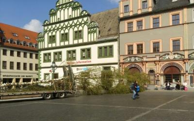 Der Kreisvorstand der IG BAU ist auf dem Markt in Weimar in Stellung gegangen. Mitgebracht haben sie ein noch längere Birke als im letztem Jahr.